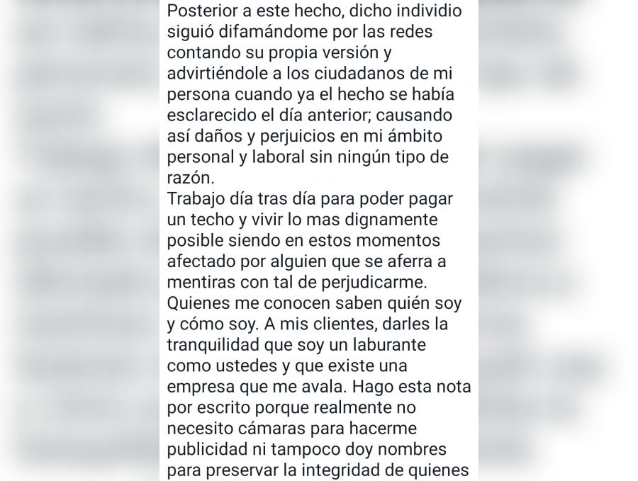 Quienes me conocen saben quién soy y cómo soy. A mis clientes, darles la tranquilidad que soy un laburante como ustedes y que existe una empresa que me avala. Hago esta nota por escrito porque realmente no necesito cámaras para hacerme publicidad ni tampoco doy nombres para preservar la integridad de quienes corresponde. Del resto se hará cargo la justicia.